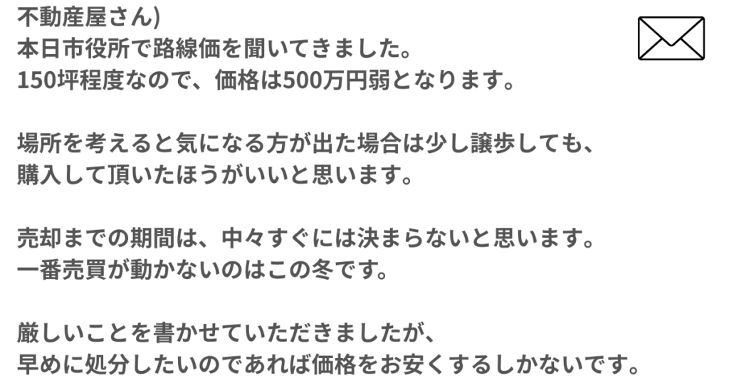 今まで不動産売買の経験がなかった私たちにとって、土地はなんとなく高く売れるものというイメージを持っていたように気づいた瞬間でもありました。