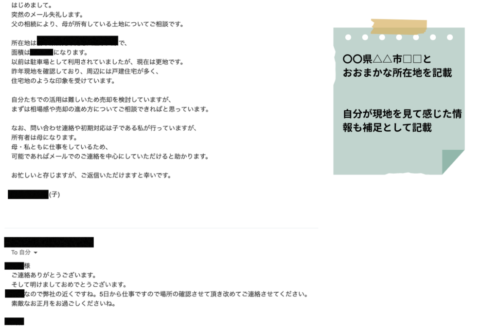 また、土地の所有者は母ですが、 実務上の問い合わせ窓口は私が担当していることも、簡単に伝えています。